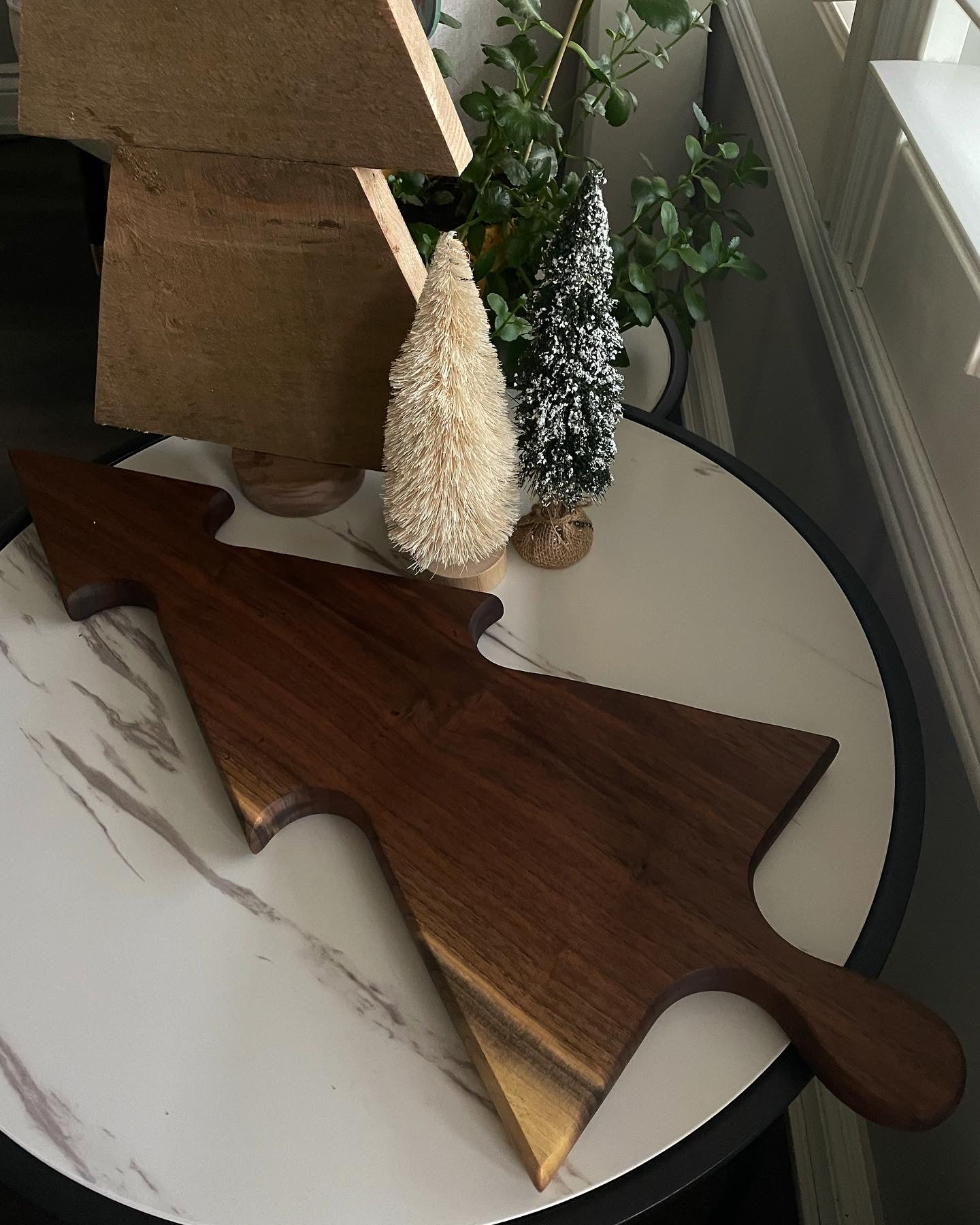 Make your holiday celebrations extraordinary with our exquisite Christmas tree-shaped charcuterie board. Handcrafted from luxurious black walnut wood, this stunning piece stands at an impressive 27" tall, complete with a convenient handle for effortless serving and a touch of festive charm.