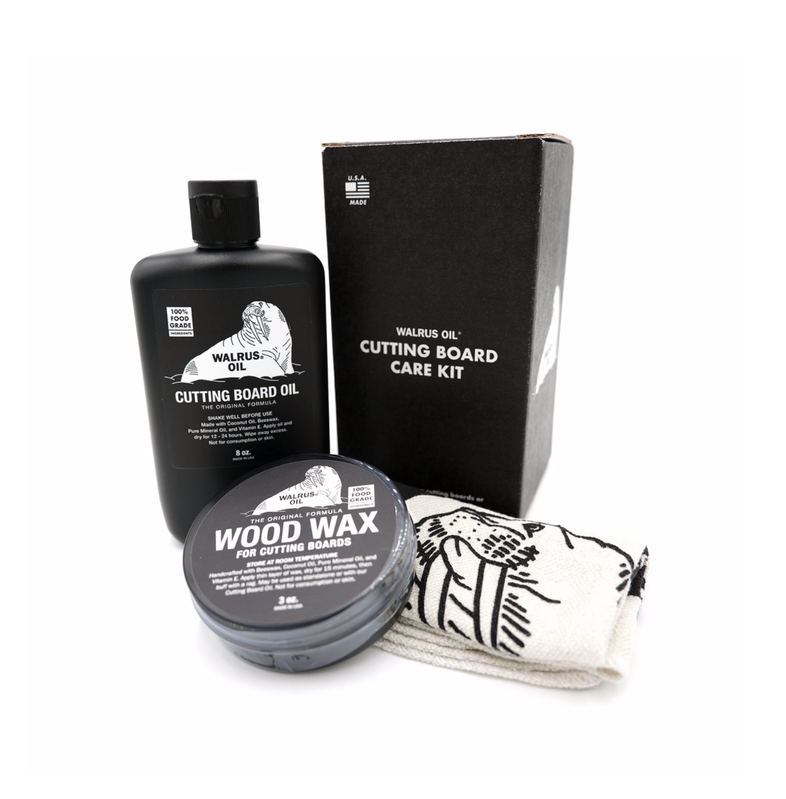 The Cutting Board Care Kit by Walrus Oil is a collection of our cutting board products, plus a buffing rag, all packaged in an exclusive collectible box. Perfect as a gift for the woodworker in your life, whether they're a seasoned professional or hobbyist just getting started. Also great for the home chef who has a wooden cutting board that needs some extra love.